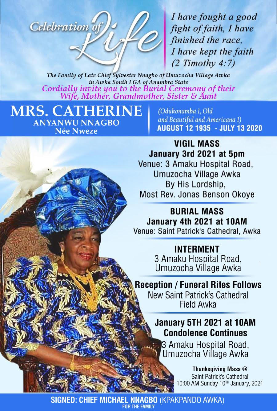 Gentlemen, Chief Mike Nnagbo(Kpakpando Awka) our mutual friend lost his beloved Mother,(Late Mrs Catherine Anyanwu Nnagbo) a couple of weeks back and the burial ceremonies have now been fixed for  3rd, January 2021.